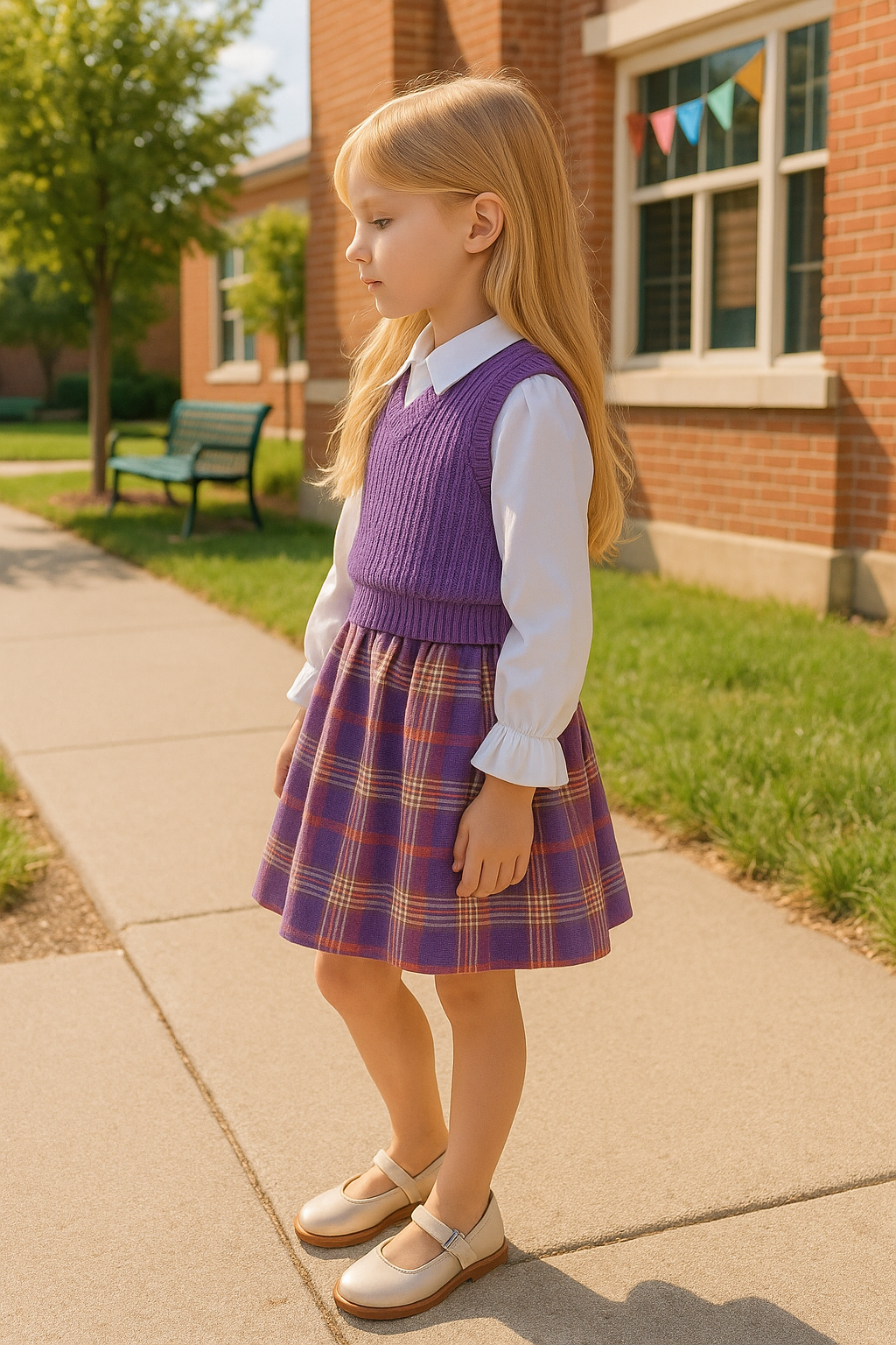 Enssemble trois piéces gilet tricoté – chemise blanche – jupe a caraux